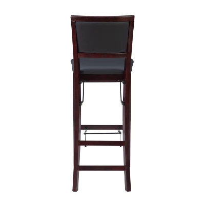 Elevate your home’s aesthetic with the 30″ Keira Padded Back Folding Bar Stool, where style effortlessly converges with convenience, creating a flawless fusion of elegance and practicality.Whether you’re hosting a dinner party or just seeking an extra dash of sophistication in your dining area, this folding stool is your ideal choice. Its wooden frame boasts a rich merlot finish that adds a touch of timeless charm to any setting. The dark brown faux leather padded seat not only exudes the appearance of genuine leather but also ensures your comfort as you dine or entertain. Plus, with front and rear supports providing extra stability, you can sit back and relax with confidence.