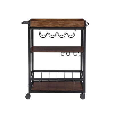 - Black Metal finish kitchen cart featuring a wood-planked top compartment