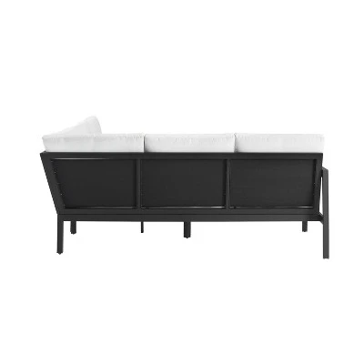 This modern sectional sofa creates a home base for your family and friends during outdoor parties. The sturdy aluminum frame supports up to 5 comfortably, while the black powder coated finish protects against rust and lends itself to a sleek aesthetic. The plush cushions are upholstered in white Sunbrellaβ’ fabric that is fade, stain and mold resistant, so you can enjoy a like new look and feel for years to come. Matching chairs, tables and more are also available for purchase.