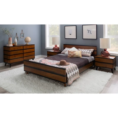 An updated take on a retro look, this midcentury modern nightstand adds a touch of vintage style to your bedroom decor. Made from warmly colored wood, this two drawer piece provides ample storage space for all your bedside necessities. The sturdy dresser top is suitable for a lamp, cell phone, book, glass of water or anything else you need within arm’s reach. The two drawers glide on smooth metal slides and are the perfect location to tuck away bedtime essentials. Simply attach the four legs and your nightstand is assembled.