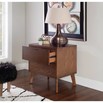 A Mid-century modern bedroom nightstand with stylish bronze hardware, this distinguished table offers two drawers for ample storage. Ash veneer in a medium brown, walnut stain bring out the natural grain formations. Four tapered legs are the only assembly needed on this stunning piece. One drawer nightstand, dresser and four drawer chest also available.