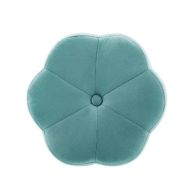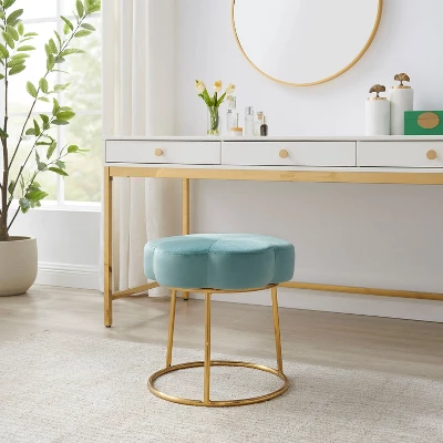 Inspired by boho design, a perfect pairing of minimal lines while still conveying a luxurious style. Plush light teal velvet is used to create this subtle floral shape that offers soft padding for comfort. The foundation is an elegant gold color plated base. Sitting 17.75 inches off the floor, this comfortable stool can fit under a makeup vanity, bathroom prep table, desk, or anywhere. Adds a welcome pop of color to any room. Multiple colors to mix and match.