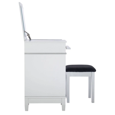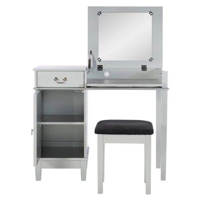 The Silver Lattice Vanity Set is ideal for any modern or contemporary styled bedroom. The spacious top has room for a variety of cosmetics, jewelry and other beauty supplies. Half of the top lifts to reveal a large mirror and open storage space. A single drawer has a silver decorative handle and opens to reveal additional storage. The left side of the vanity features a lattice designed mirrored door that opens to reveal a large storage space. Finished in a silver, the vanity is complemented by a thick padded stool with a black upholstered seat.